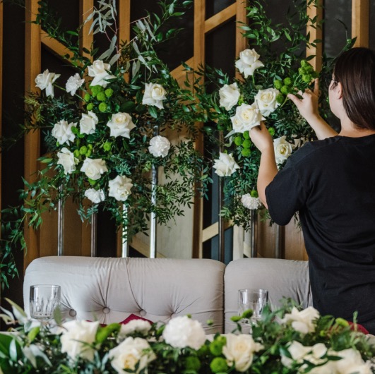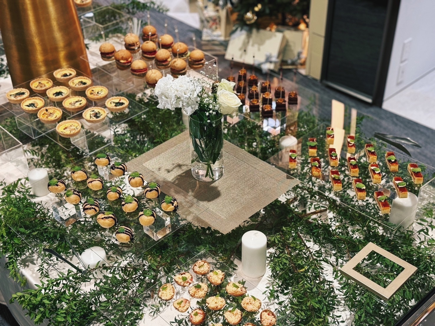 お料理だけでなくイベントを行う空間のプロデュースも承っております。 生花と什器を使ったフラワーアレンジメントやビュッフェ台の装飾、クライント様のロゴの入ったフォトパネルの手配など、本来複数のベンダーにご依頼する内容をワンストップで請け負うことができます。